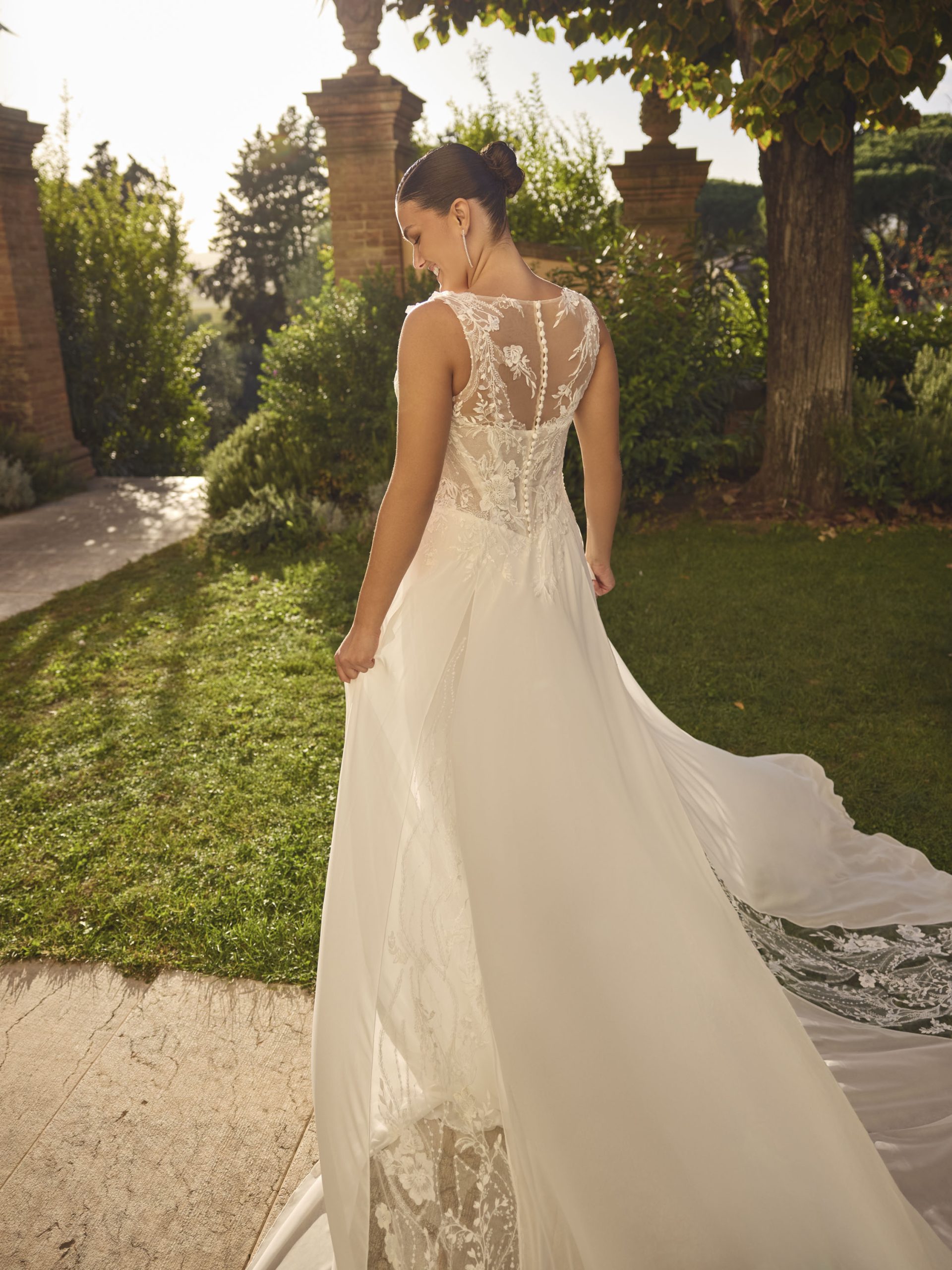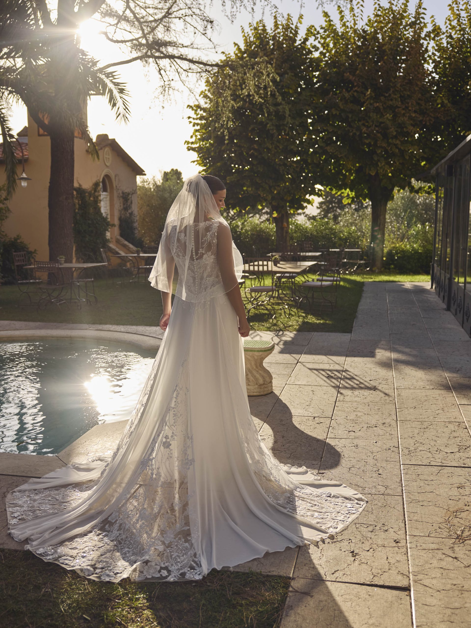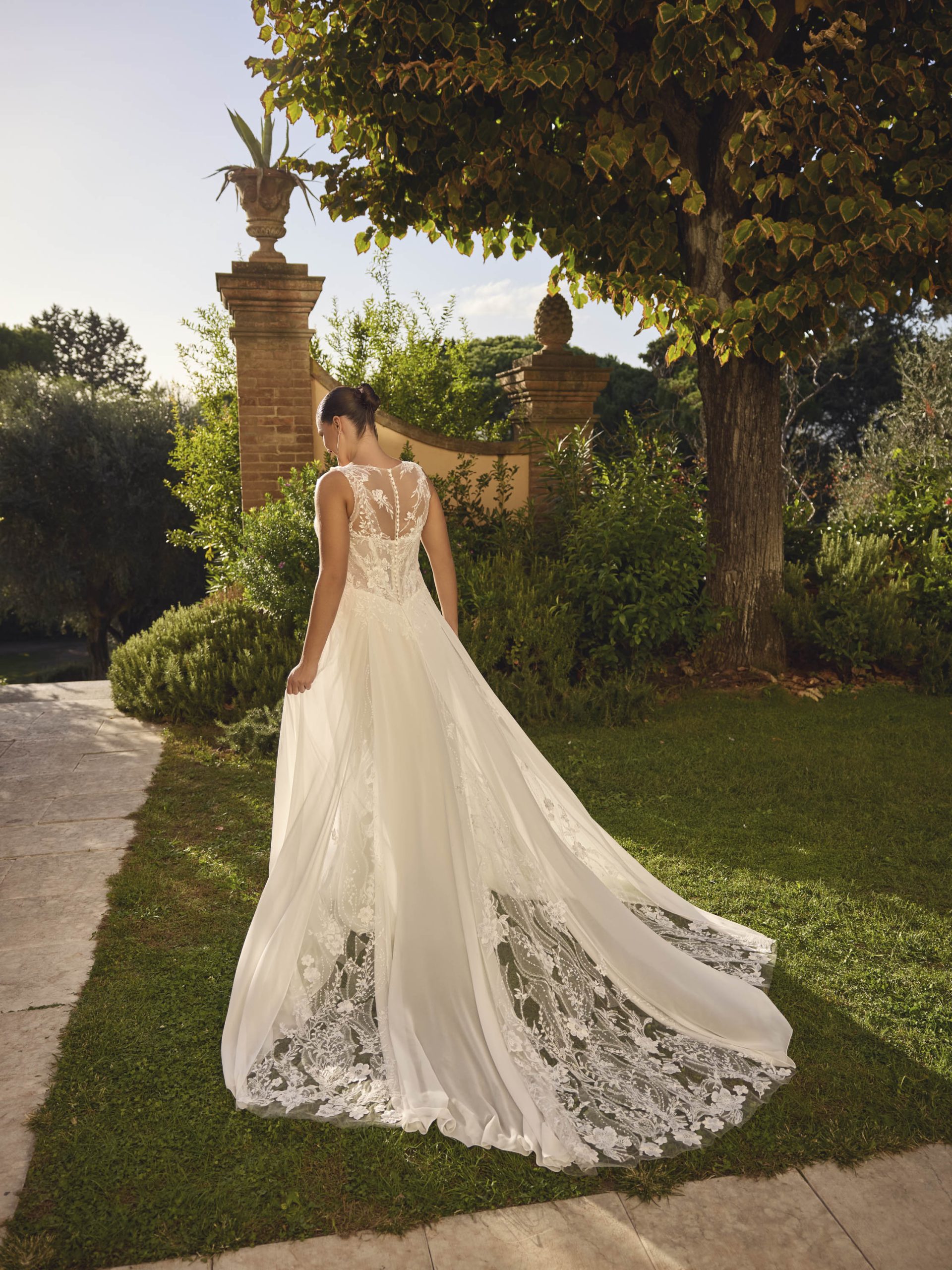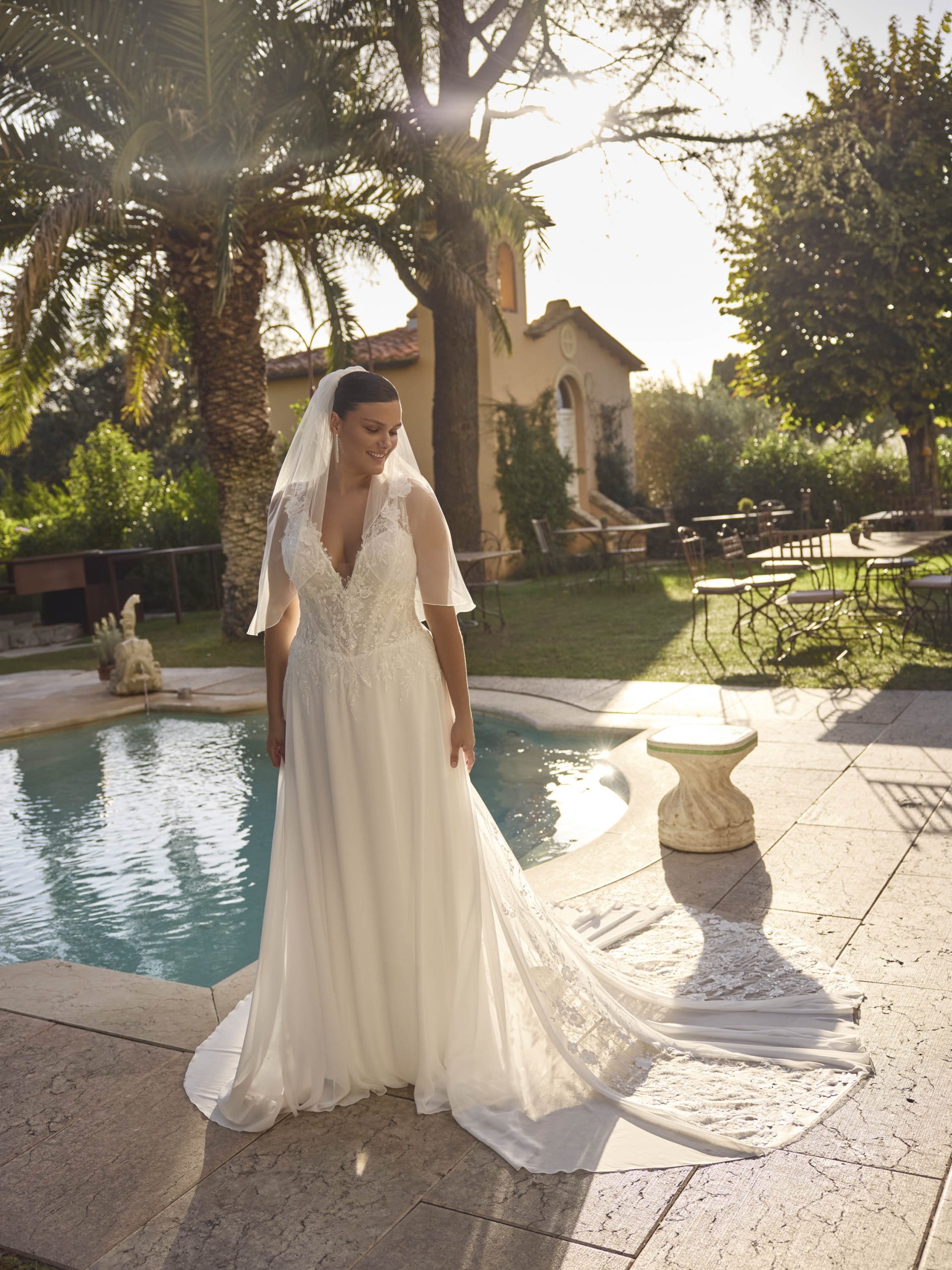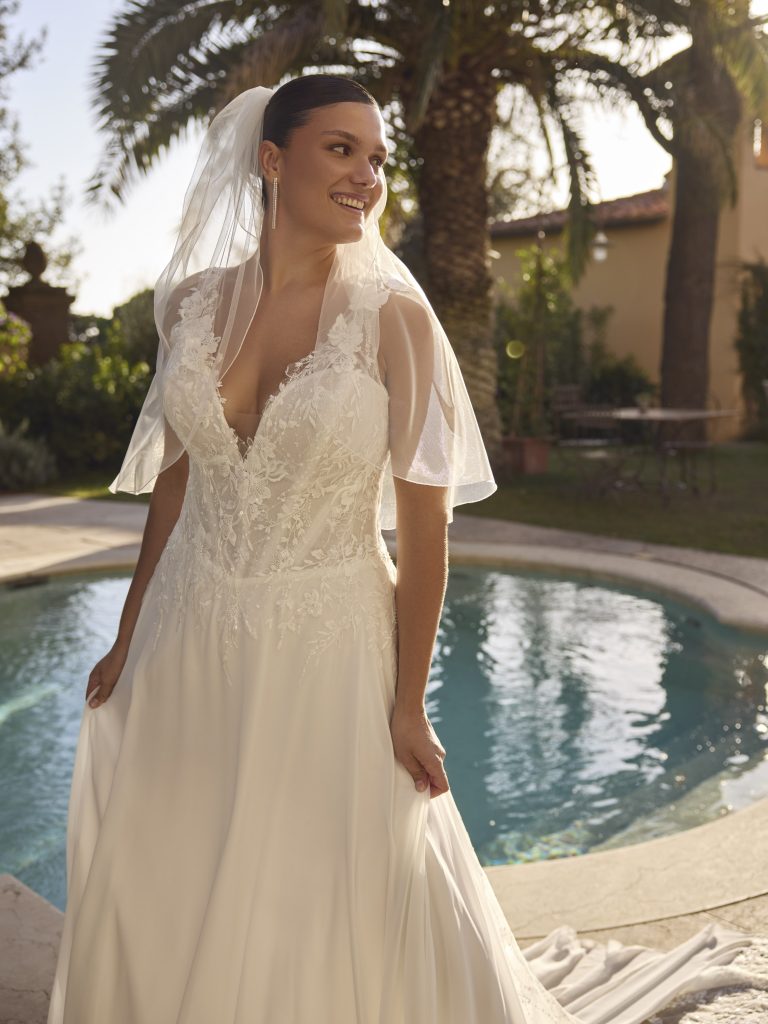 Abito da sposa A-line con scollatura a V, corpetto in pizzo e gonna in chiffon. La morbidezza dei tessuti esalta le forme, rendendolo adatto alle spose curvy. Disponibile nei nostri atelier di Rovigo e Taglio di Po.