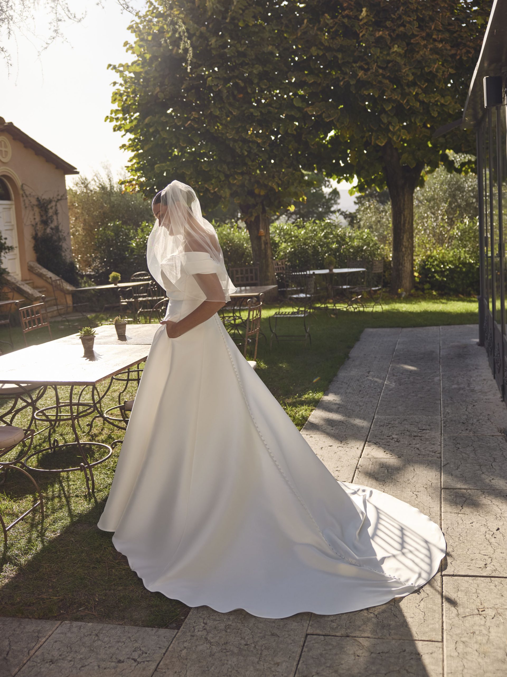 Abito da sposa A-line in mikado con scollatura off-the-shoulder e ampia gonna con tasche. Disponibile nei nostri atelier di Rovigo e Taglio di Po.