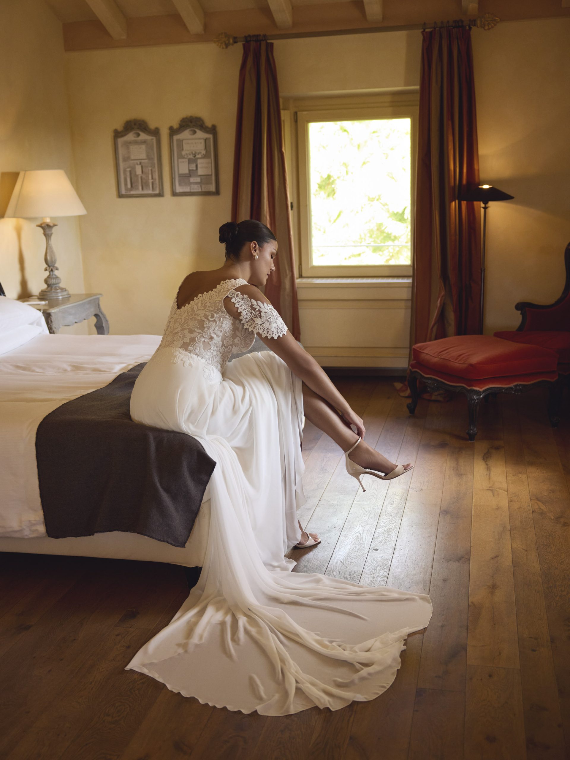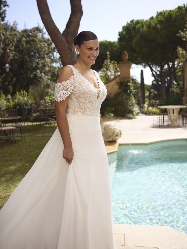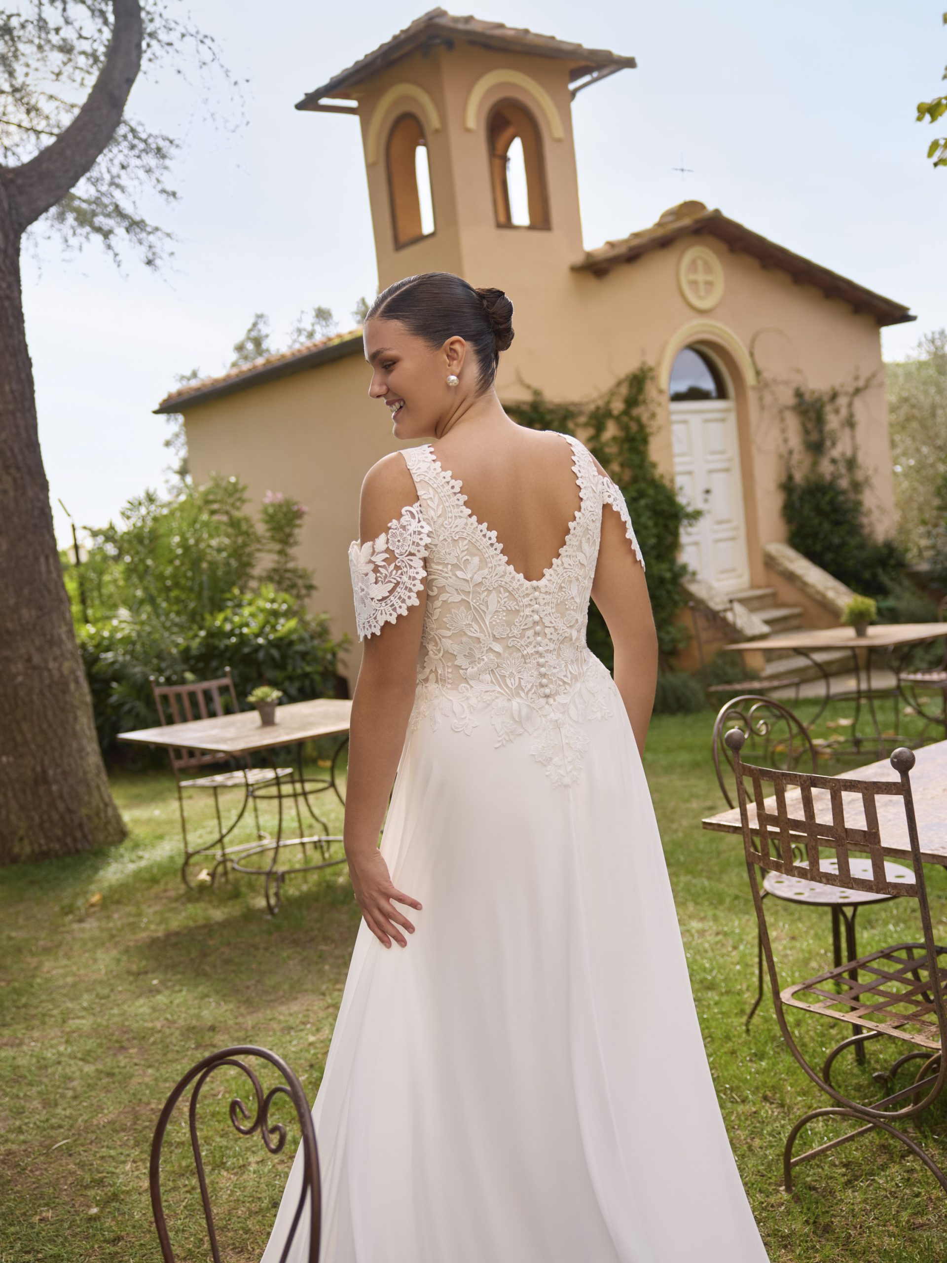 Abito da sposa bohemien con profonda scollatura a V e corpetto. Le maniche con spalle scoperte e la gonna in chiffon valorizzano la figura, rendendolo adatto alle spose curvy. Disponibile nei nostri atelier di Rovigo e Taglio di Po.