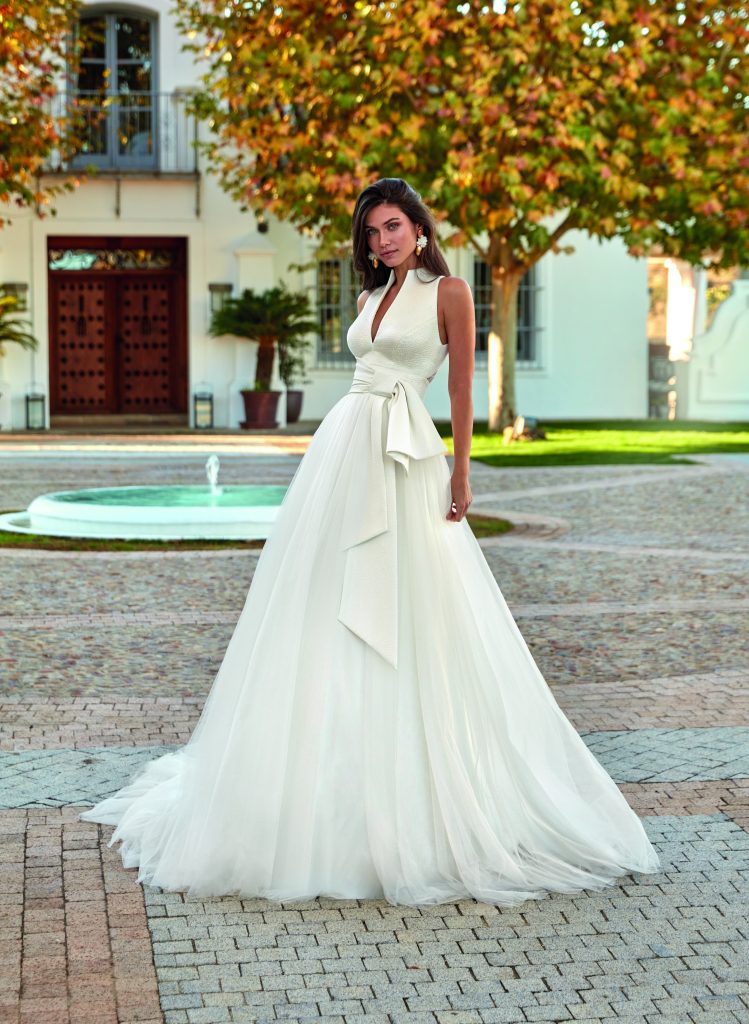 Abito da sposa principesco in tulle setoso e jacquard. Ha un corpetto con scollo all’americana aperto, la gonna in tulle e la schiena scoperta. Disponibile nei nostri atelier di Rovigo e Taglio di Po.