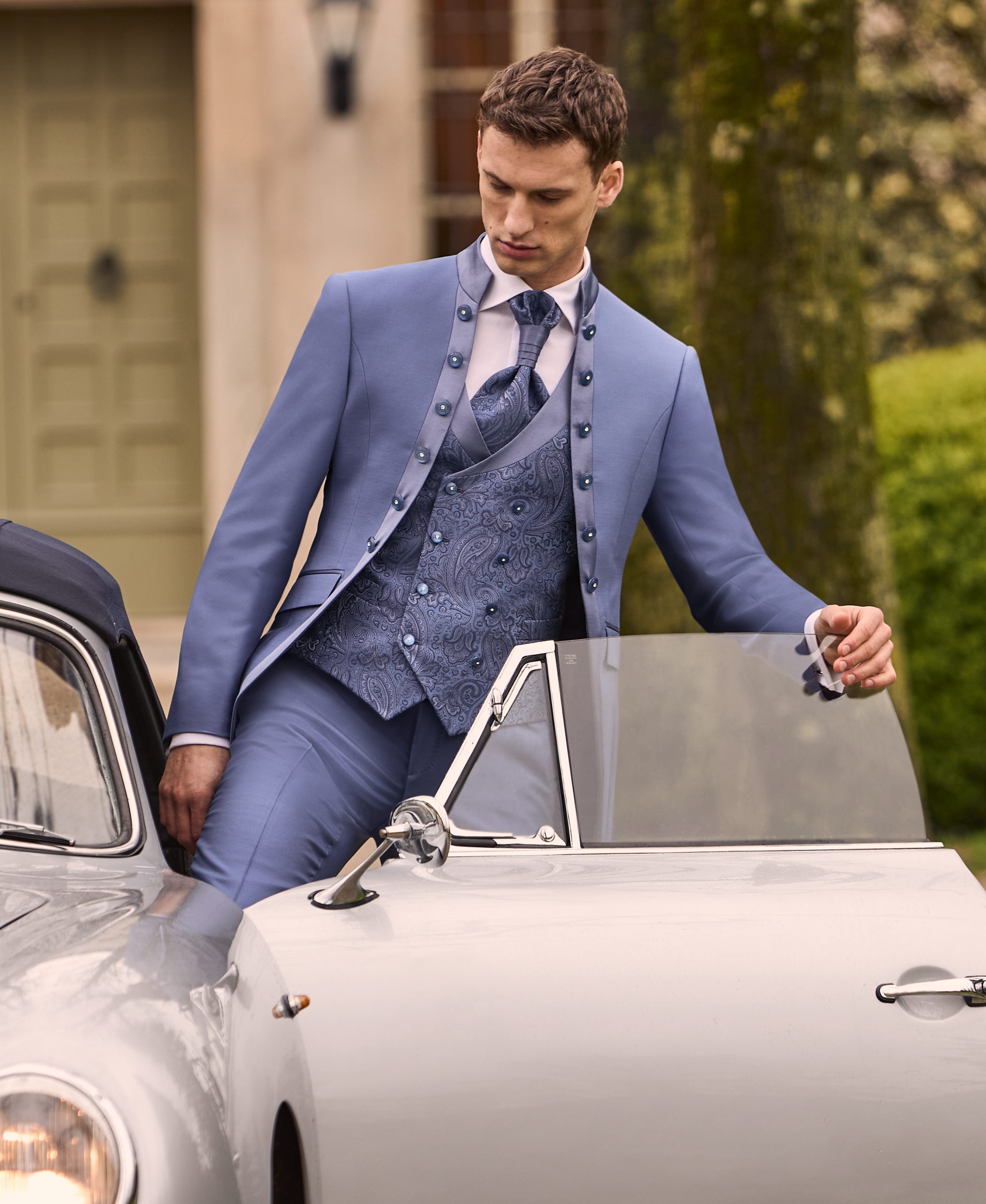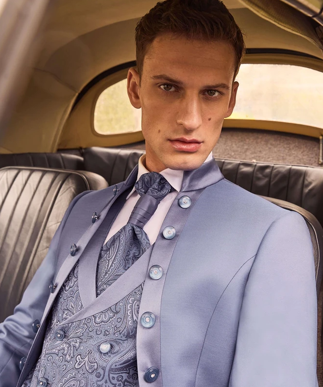 Abito da sposo color azzurro carta da zucchero con panciotto damascato. Questo abito da sposo della collezione di Luigi Bianchi 2025 è disponibile presso il nostro atelier di Rovigo, comodo a tutti gli sposi di Rovigo, Padova, Venezia, Chioggia, Ferrara.