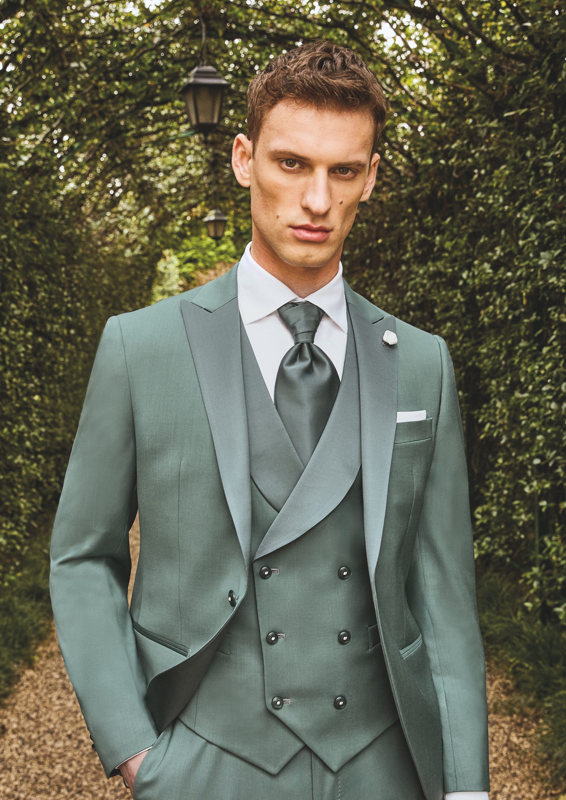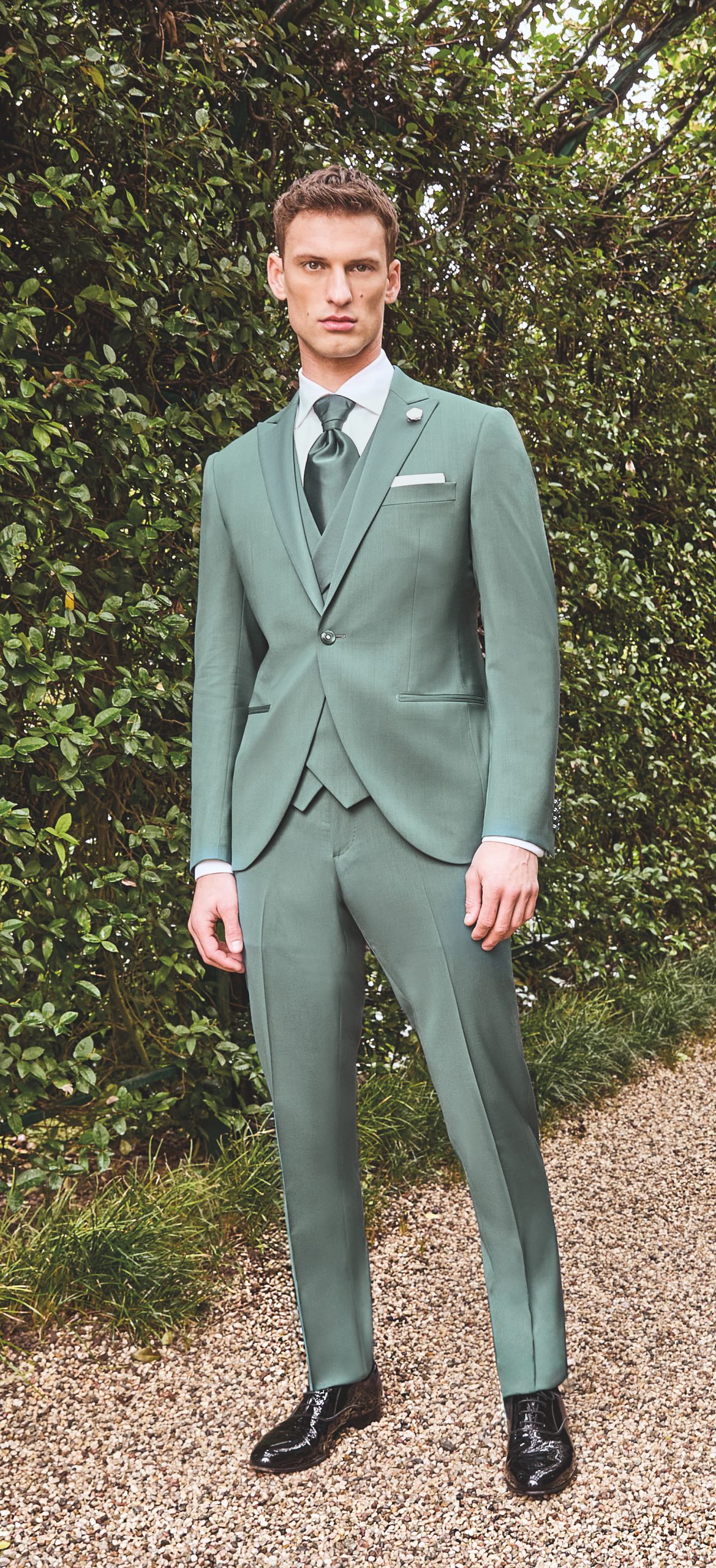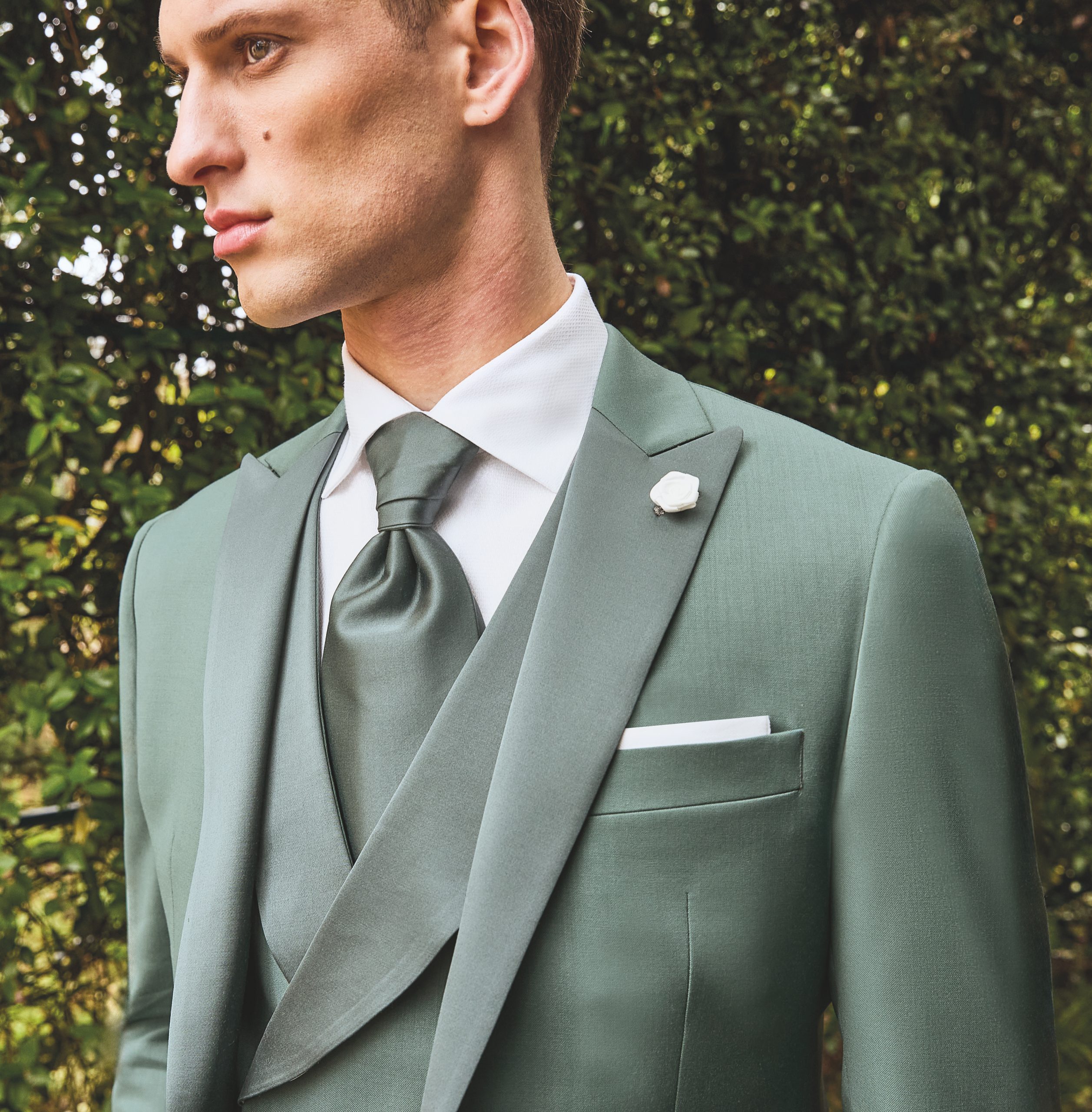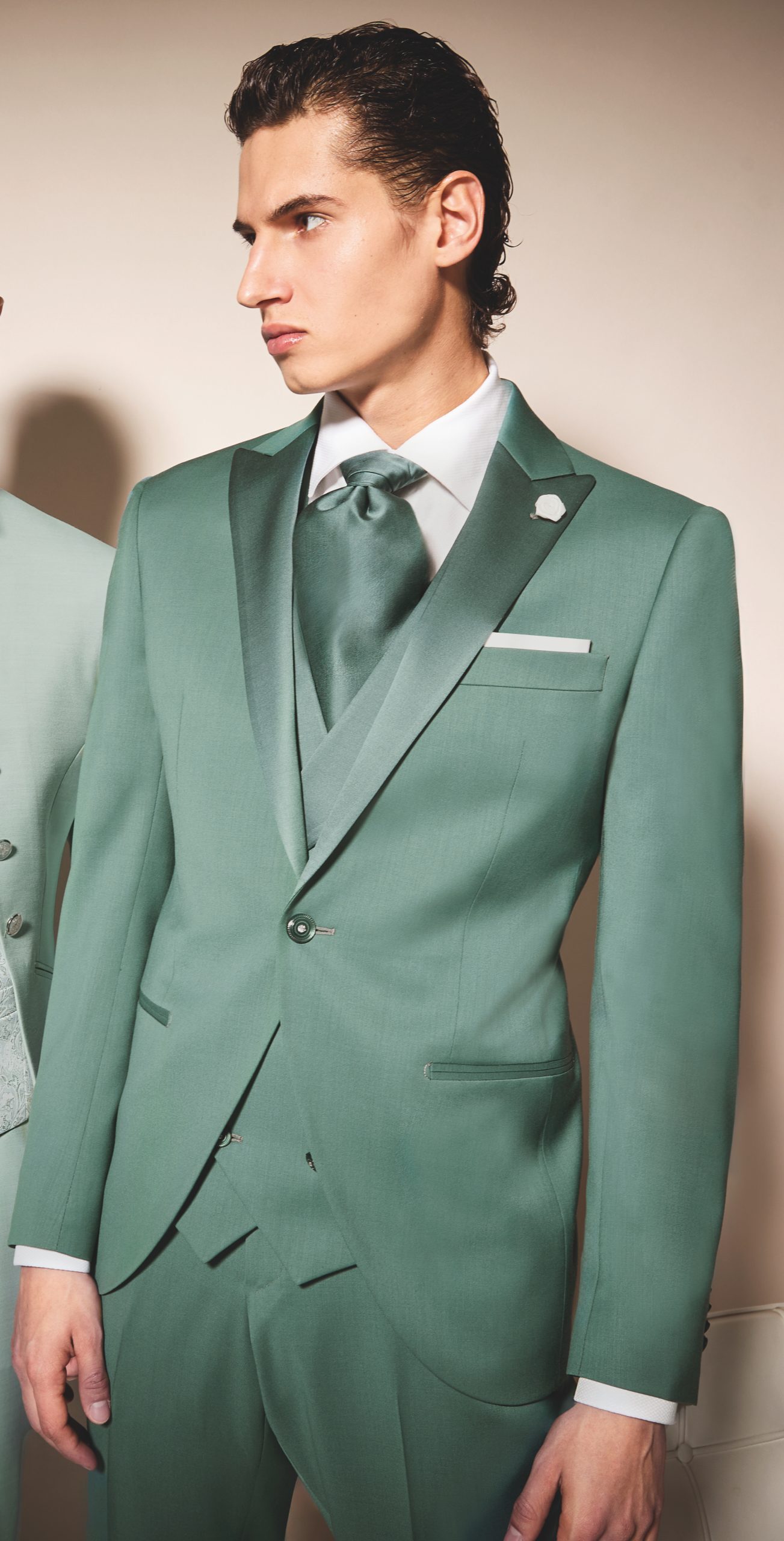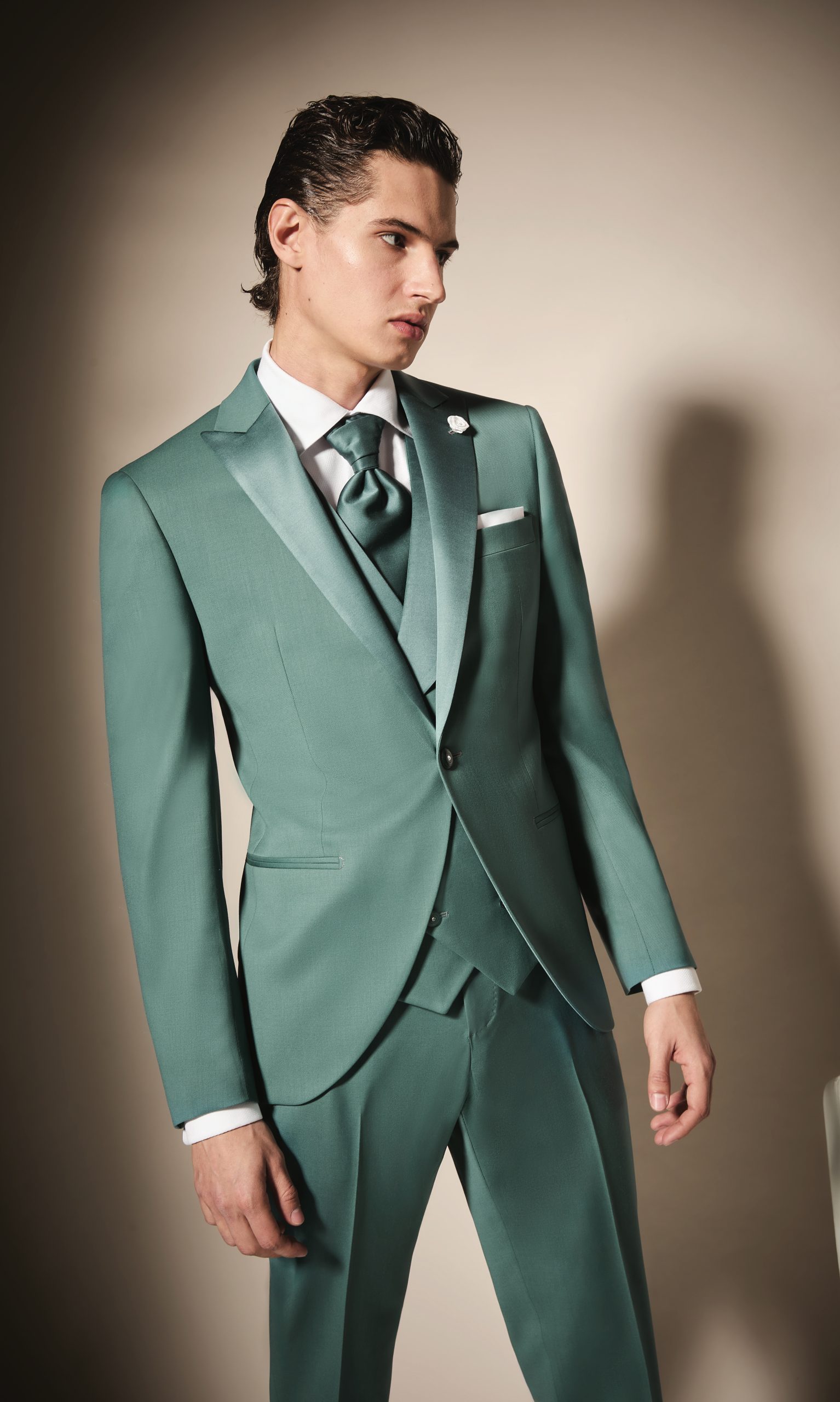 Abito da sposo minimale color verde salvia. Questo abito da sposo della collezione di Luigi Bianchi 2025 è disponibile presso il nostro atelier di Rovigo, comodo a tutti gli sposi di Rovigo, Padova, Venezia, Chioggia, Ferrara.